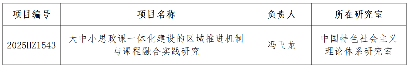 近日,陕西省社会科学界联合会公布了“宝鸡市教育高质量发展课题”专项项目立项名单,中特中心骨干研究员冯飞龙教授负责的《大中小思政课一体化建设的区域推进机制与课程融合实践研究》获准立项,项目经费1万元。